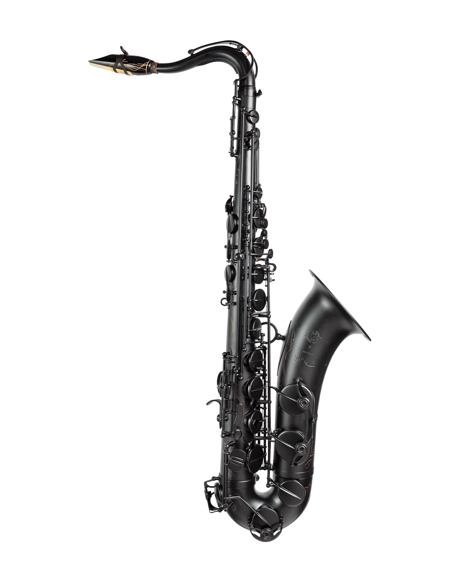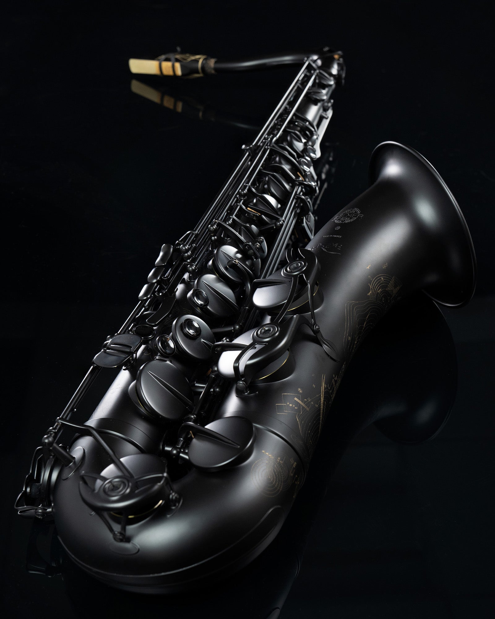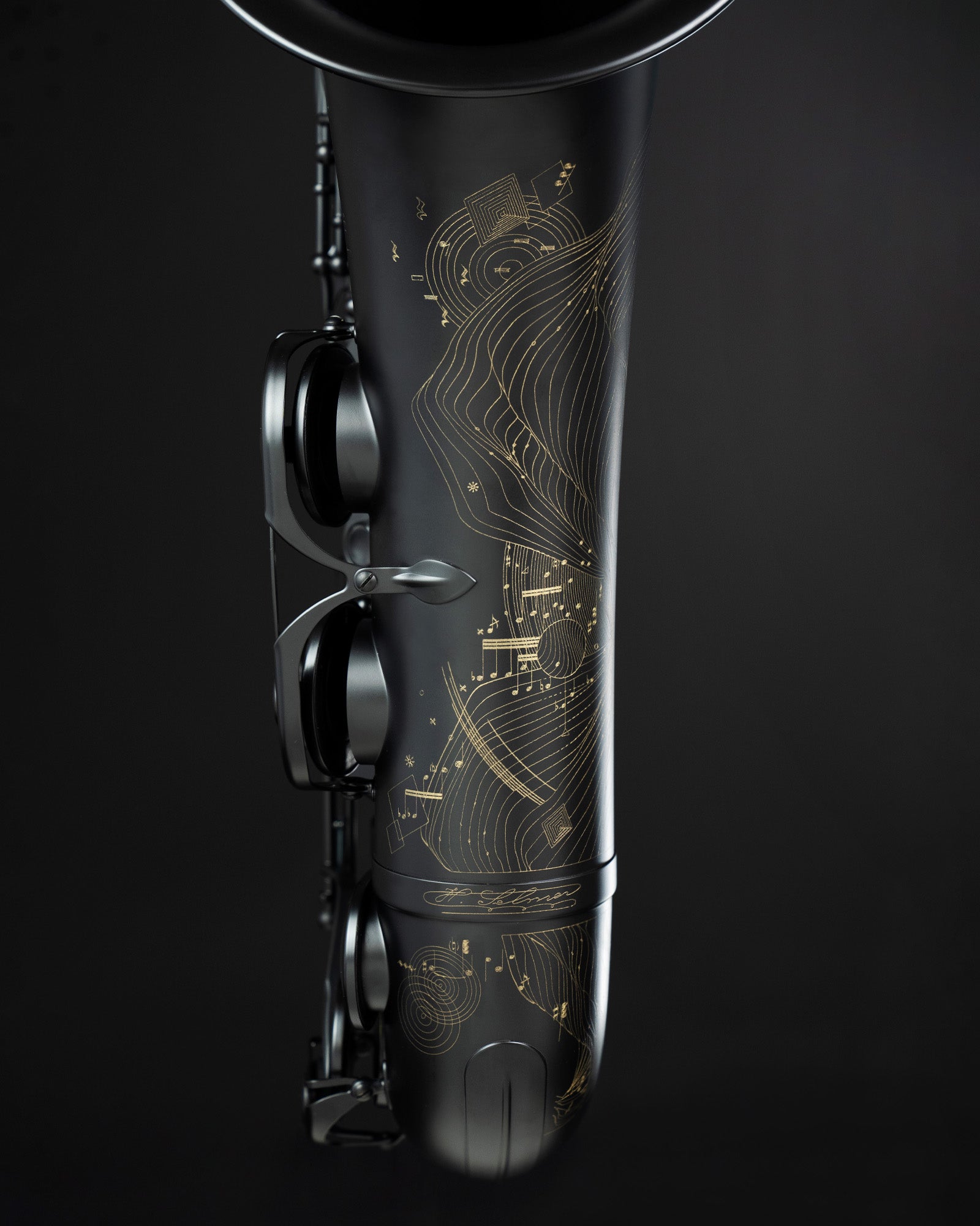 From the glossy black crystal key touches to the neck with a blend of synthetic and natural black cork, the Supreme Tenor Limited Edition 2025 explores a rich and varied palette of blacks. The body and keys are finished in matte black, contrasting and highlighting an engraving that reveals the brass’s brilliance. This motif embodies an artistic vision of a musical score - a true calligraphy of musical notation that extends to the body-to-bell ring, the bell and the guard.